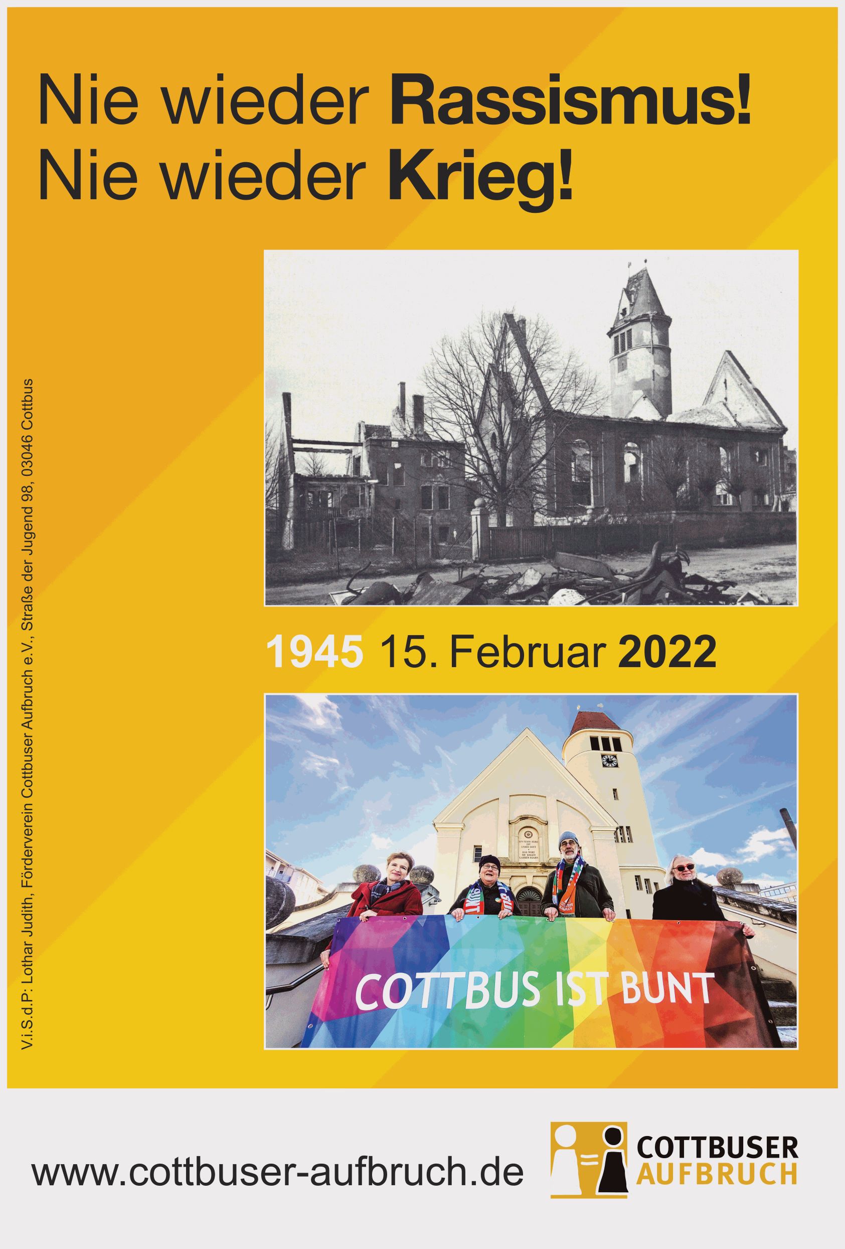 Am 15. Februar ab 13 Uhr auf dem Ernst-Mucke-Platz veranstaltet der Arbeitskreis gegen Rechtsradikalismus Schmewllitz unter dem Motto "Bunte Mützen statt braune Kappen" eine Gedenkveranstaltung, zu der unser Oberbürgermeister ein Grußwort spricht.
